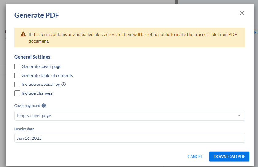 You can download proposals as a PDF with a cover page and table of contents. This can be accessed by clicking "Download PDF" at the top of the proposal toolbox.