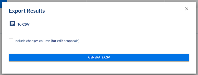 If you’d like for the CSV to indicate the proposed changes for any “edit” proposals, check the “Include changes column” box in the “Export Results” modal.
