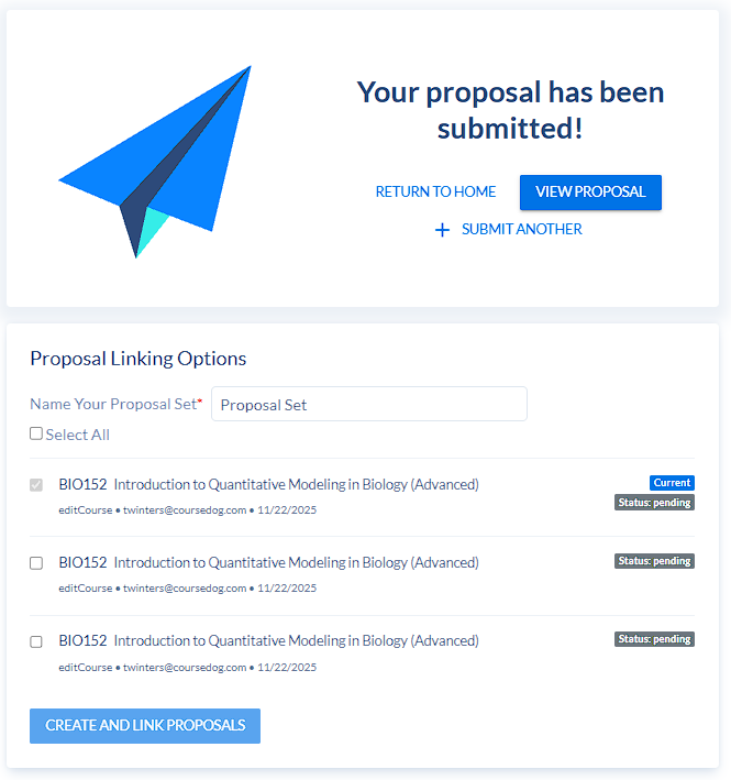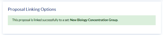 If your proposal isn’t already linked to a set, after you submit your proposal you’ll see “Proposal Linking Options” on the submission confirmation screen.